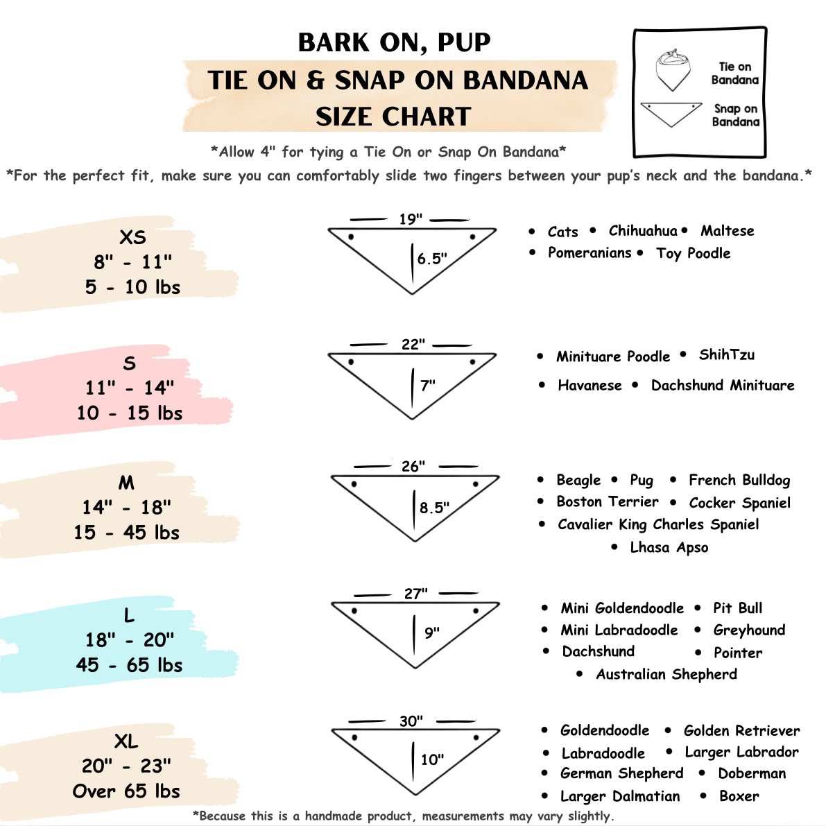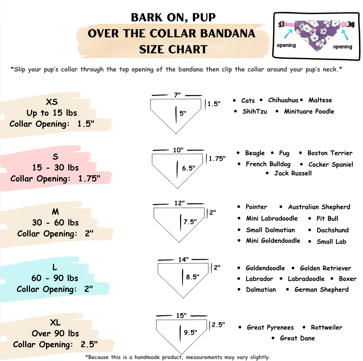 Our dog bandanas are available in XS, S, M, L, and XL to fit pups of all breeds and sizes. See our size chart for exact measurements.