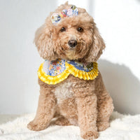 Turn heads with this girl dog cape bandana, a one-of-a-kind accessory handmade with love. Featuring a charming patchwork of floral and gingham prints, finished with a yellow ruffle trim, this cape style bandana is perfect for pups who love to dress up in style. Whether for birthdays, photoshoots, special occasion, or everyday elegance, this piece adds a touch of sweetness to your pup's look.
