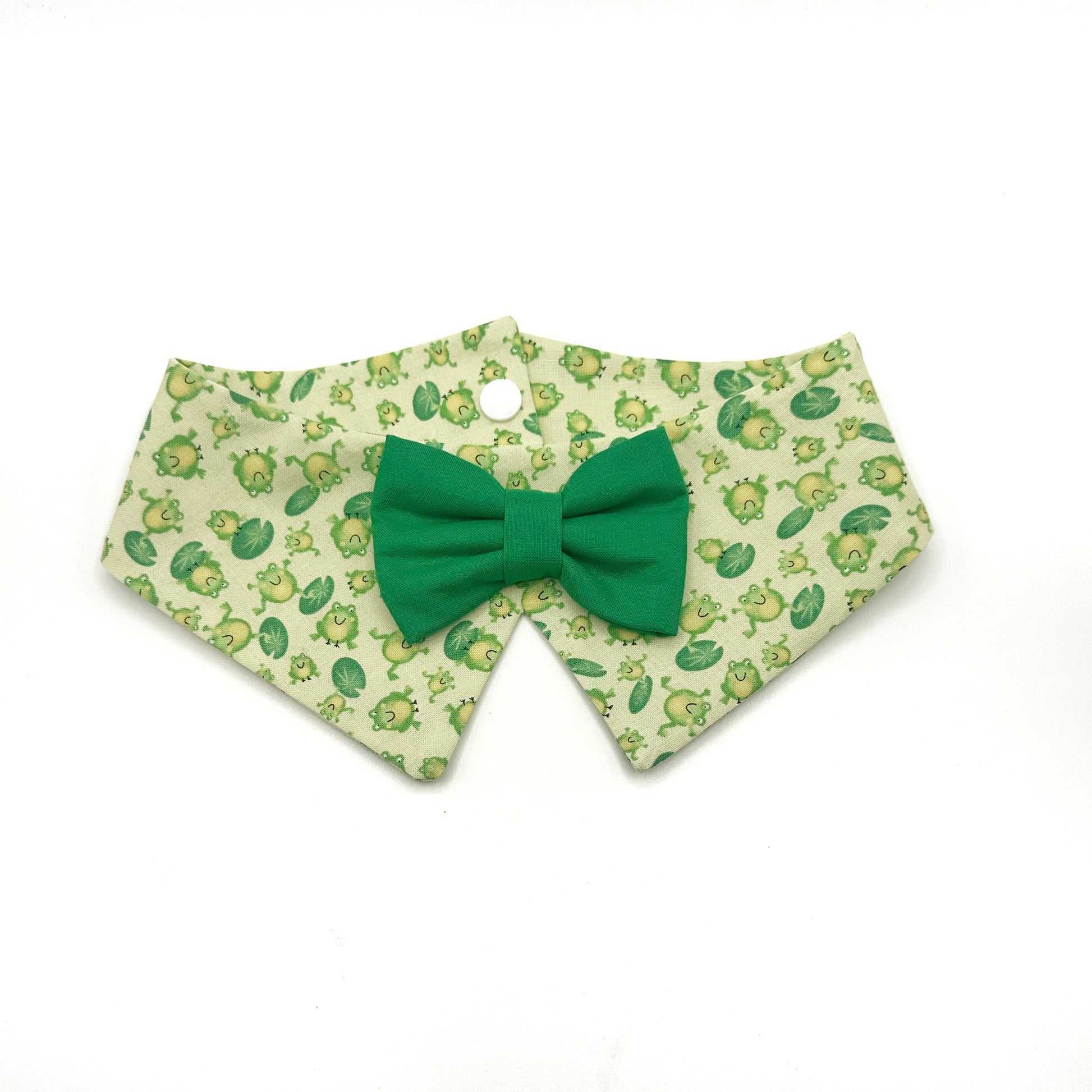 Add a touch of fun and charm with our frog print tuxedo dog bow tie collar! Handmade and finished with a bold green bow, this stylish piece is perfect for weddings parties, photos, or everyday wear. Designed with secure snap closures it's easy to put on and comfortable for your pup to wear all day.