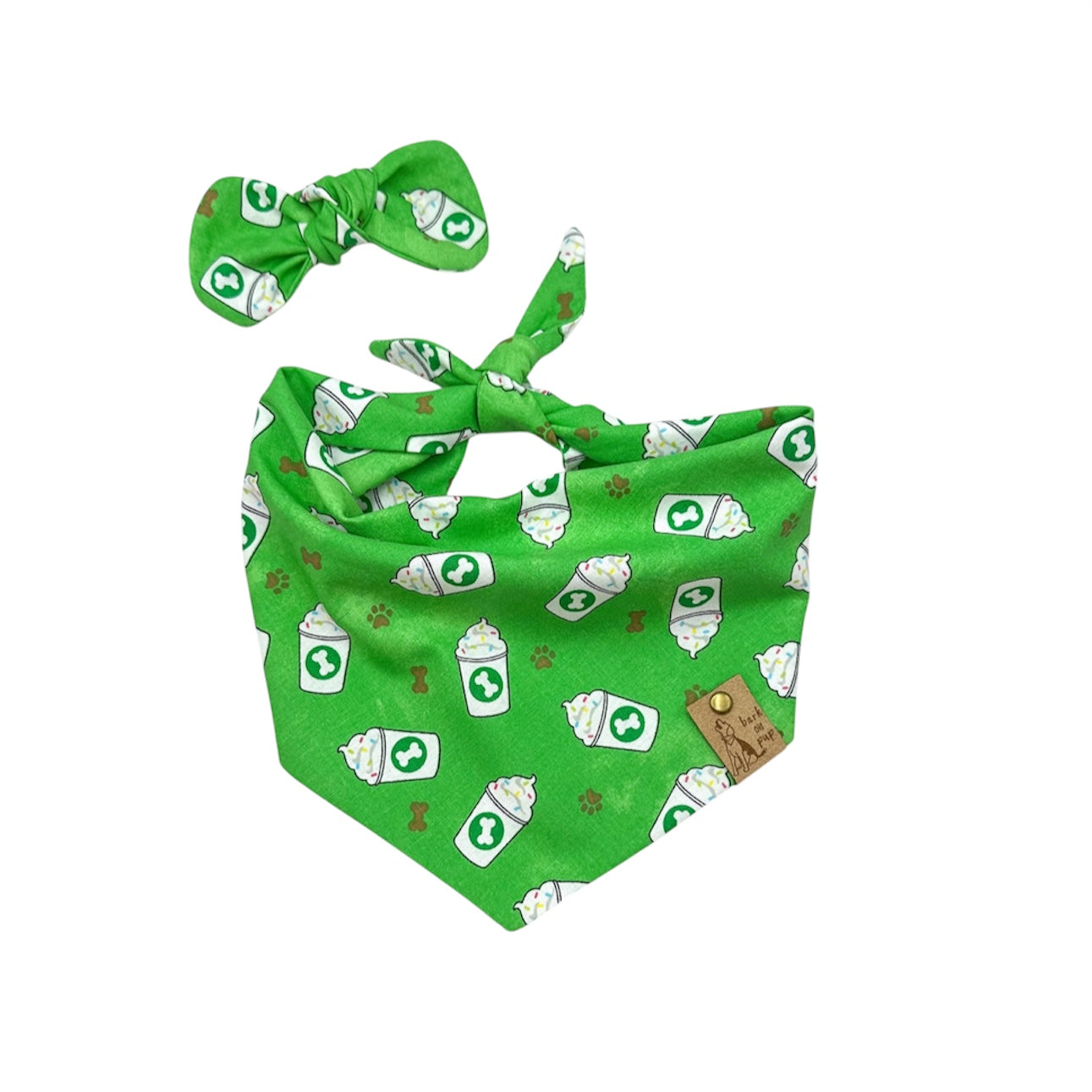 Give your pup a café-chic look with our Puppuccino dog bandana, perfect for everyday wear! Made with a vibrant green fabric featuring whipped-cream topped coffee cups, paw prints, and bones, this handmade accessory is both stylish and fun.