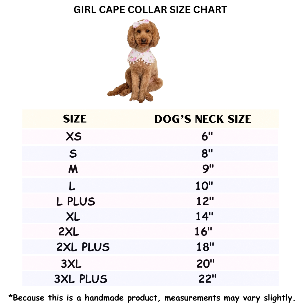 Our Girl Cape Bandanas are available in XS, S, M, L, and XL, 2XL, 3XL to fit pups of all breeds and sizes. See our size chart for exact measurements.